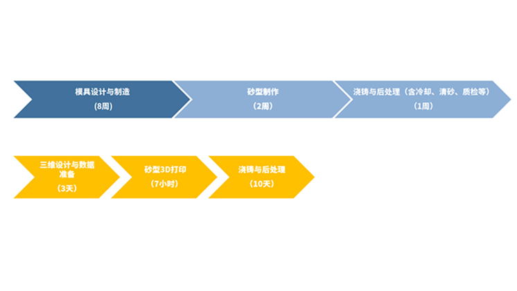 傳統(tǒng)鑄造依賴模具制造,周期長達10-12周,而砂型3D打印通過數(shù)字化模型直接生成砂型,省去模具環(huán)節(jié),將研發(fā)周期從數(shù)月壓縮至數(shù)天。