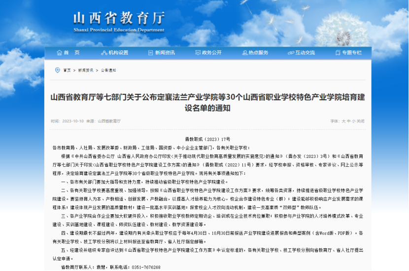 2023年9月25日,省教育廳、省人社廳、省發(fā)展改革委等7部門聯(lián)合發(fā)布通知,公布了定襄法蘭產(chǎn)業(yè)學(xué)院等30個山西省職業(yè)學(xué)校特色產(chǎn)業(yè)學(xué)院培育建設(shè)名單。按照《中共山西省委辦公廳 山西省人民政府辦公廳印發(fā)<關(guān)于推動現(xiàn)代職業(yè)教育高質(zhì)量發(fā)展的實(shí)施意見>的通知》(晉辦發(fā)[2023]3 號)和《山西省教育廳等七部門關(guān)于印發(fā)<山西省職業(yè)學(xué)校特色產(chǎn)業(yè)學(xué)院建設(shè)工作方案>的通知》( 晉教職成[2022]11號)要求,經(jīng)學(xué)校申報、資格審核、專家評議,康碩(山西)智能制造有限公司、晉城富士康智能制造職業(yè)培訓(xùn)學(xué)校有限公司、山西宏安翔科技股份有限公司聯(lián)合申請的“晉城技師學(xué)院智能制造產(chǎn)業(yè)學(xué)院”被列入了“山西省職業(yè)學(xué)校特色產(chǎn)業(yè)學(xué)院培育建設(shè)名單”:
