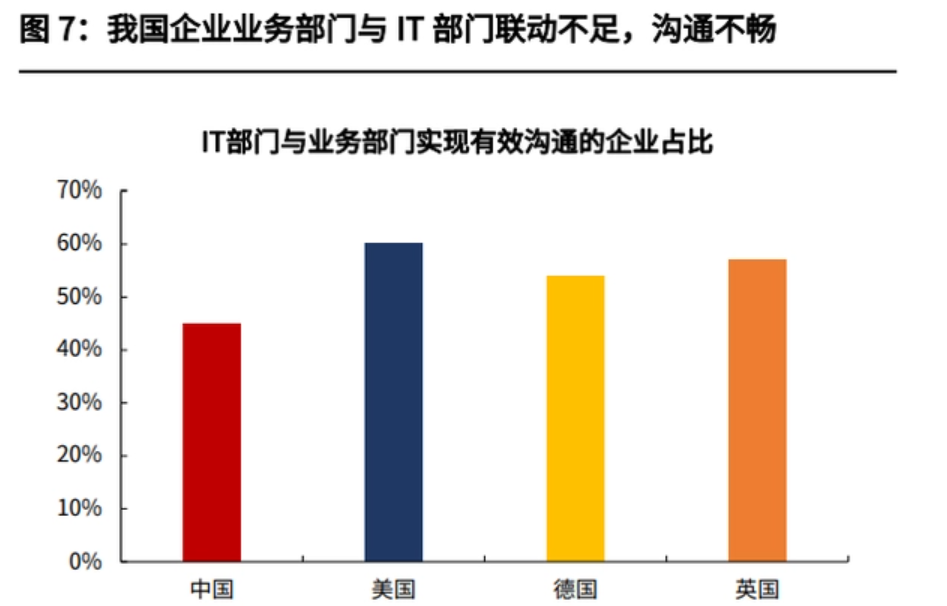 由于智能制造的推進(jìn)涉及生產(chǎn)、銷售和 IT 等多部門,部門間的信息溝通效率和通力合作程度,是充分挖掘企業(yè)實(shí)際需求,并決定企業(yè)數(shù)字化改造發(fā)力方向和 實(shí)際效果的重要因素。在這一方面,雖然各國都多少存在業(yè)務(wù)部門和 IT 部門溝通不暢的問題,但我國相較于發(fā)達(dá)國家仍有差距。這一痛點(diǎn)問題的解決不僅需要自上而下的戰(zhàn)略設(shè)計(jì)和組織變革,也需要企業(yè)內(nèi)部基礎(chǔ)設(shè)施的有力支撐。在企業(yè)內(nèi)部基礎(chǔ)設(shè)施方面,各國數(shù)字化改造的過程中,都多少受到了原有 IT 基礎(chǔ)設(shè)施水平不足的限制,而我國企業(yè)在這一方面遇到的阻礙更大。一方面,企業(yè)生產(chǎn)、采購、財(cái)務(wù)等系統(tǒng)間數(shù)據(jù)缺乏互通互聯(lián)性,導(dǎo)致信息孤島問題的產(chǎn)生,因此各部門之間的信息溝通不暢不僅是組織架構(gòu)的欠缺,也是客觀支撐條件的不足。另一方面,企業(yè)內(nèi)部流程、資源和培訓(xùn)的缺失,也使得技術(shù)引入易而見效難, 轉(zhuǎn)型開啟易而落實(shí)難。企業(yè)在購置信息系統(tǒng)和設(shè)備時(shí),往往缺乏對自身實(shí)際條件的充分考量,也缺乏對項(xiàng)目實(shí)施難度和周期的足夠認(rèn)知。轉(zhuǎn)型不見效往往并非因?yàn)榧夹g(shù)無用,而是源自基礎(chǔ)不牢。