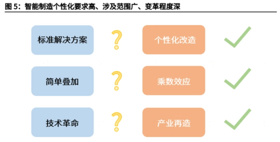 是企業(yè)再造,而不只是技術(shù)革命。智能制造的發(fā)展重點(diǎn),不在于各環(huán)節(jié)的新技術(shù)引進(jìn),而在于企業(yè)能否抓住時(shí)代機(jī)遇,實(shí)現(xiàn)自我重塑。技術(shù)對于企業(yè)的賦能效果如何,最終取決于企業(yè)戰(zhàn)略、管理架構(gòu)和業(yè)務(wù)流程能否提供有力支撐和廣闊舞臺。因此,智能制造的本質(zhì)不只是技術(shù)革命,資金投入可以直接提升軟硬件的技術(shù)水平,但不能直接提升企業(yè)創(chuàng)造新價(jià)值的能力。企業(yè)對自身的認(rèn)知和變革,才是智能制造實(shí)際成效的決定性因素??偨Y(jié)來看,智能制造個(gè)性化要求高、涉及范圍廣、變革程度深,不僅需要企業(yè)在發(fā)展戰(zhàn)略和業(yè)務(wù)流程上不斷推動變革,也需要政策進(jìn)行合理引導(dǎo)和有力扶持。智能制造將重塑過去數(shù)十年全球產(chǎn)業(yè)分工的微笑曲線,生產(chǎn)環(huán)節(jié)將不再是 可替代、可轉(zhuǎn)移的低端環(huán)節(jié),而是將成為企業(yè)產(chǎn)品力、產(chǎn)業(yè)競爭力的重要組成部分,成為高質(zhì)量發(fā)展的必由之路。在此過程中,需要政府與企業(yè)同心戮力, 在核心技術(shù)攻關(guān)、應(yīng)用經(jīng)驗(yàn)推廣、產(chǎn)業(yè)生態(tài)建設(shè)等方面開創(chuàng)新模式,建立新機(jī)制。