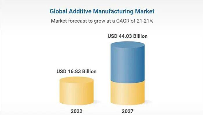 Research and Markets于2023年初發(fā)布了一份關(guān)于全球3D打印市場(chǎng)的最新研究報(bào)告。該公司估計(jì),到2027年,3D打印行業(yè)的價(jià)值將從今年的168.3億美元(約1137億人民幣)增長(zhǎng)到440.3億美元(約2975億人民幣),即2021年至2027年的年增長(zhǎng)率為21%。